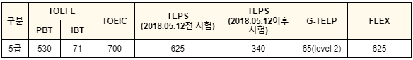 <영어><한국사> 기준 점수 : 한국사 능력검정 시험 [2급 이상] 인정범위 : 영어 및 한국사는 1차 시험 시행 예정일 전날까지 발표된 시험 점수로 인정되며 성적 인정기간 (5년) 이 2023년부터 폐지됩니다.